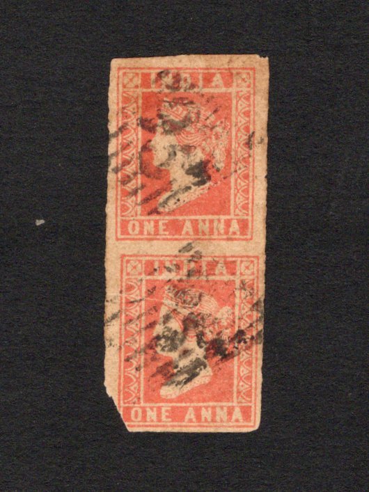 Queen Victoria (1819-1901) stamp issued by East India Company Administration in 1854-55. Printed using Die 2. Scarlet red. Lithograph. Without gum. 1 Anna. Pair with the bottom stamp damaged at right corner.